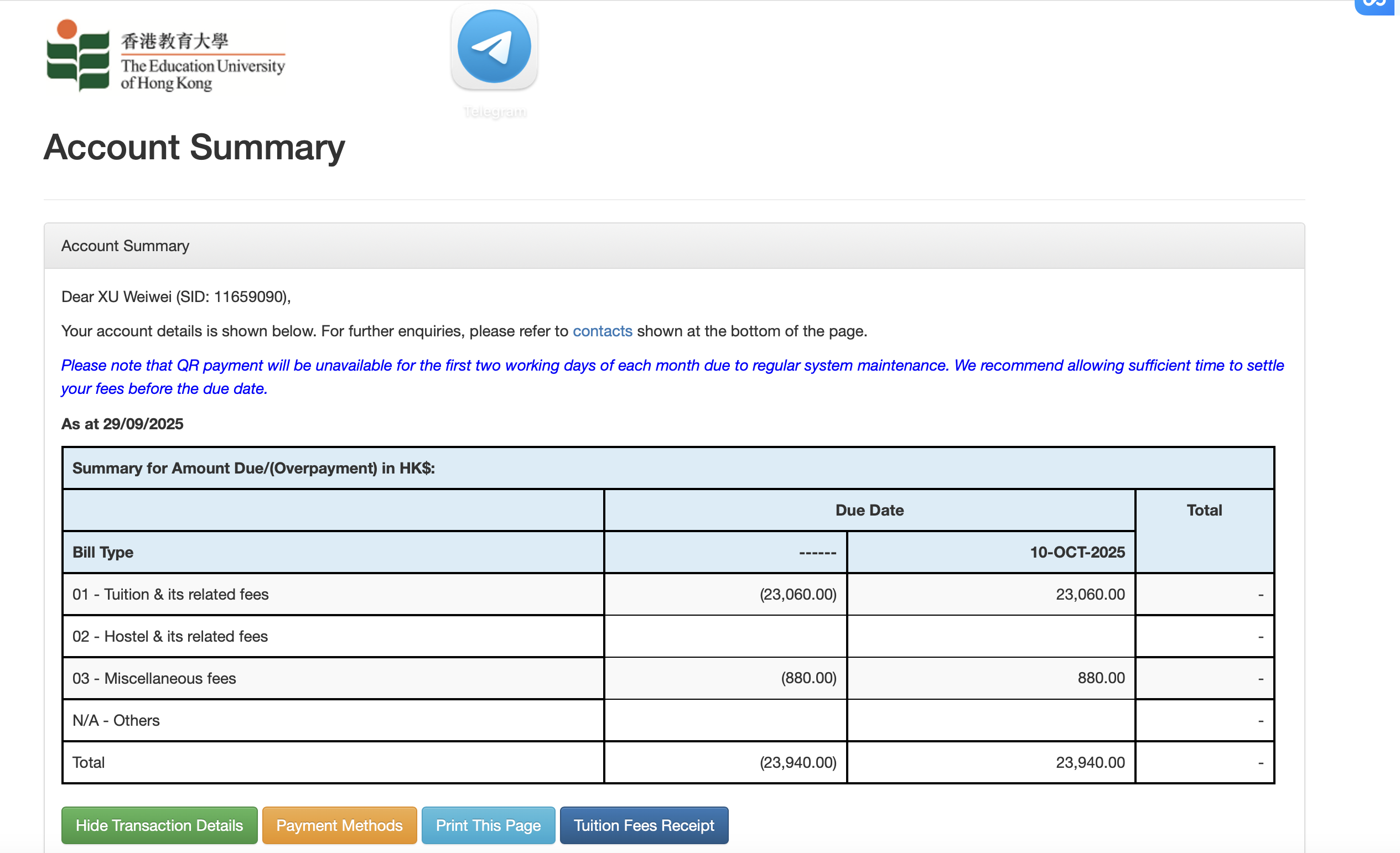 交完了这学期的学费后,